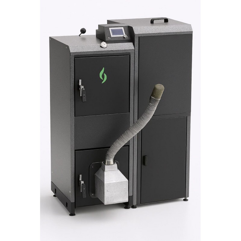 - Компактность: Ширина котла с бункером составляет всего 890 мм, что делает его идеальным решением для небольших котельных.