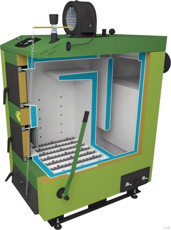 Котел оснащается трехтяговой камерой сгорания, имеет верхний способ загрузки горючего материала.